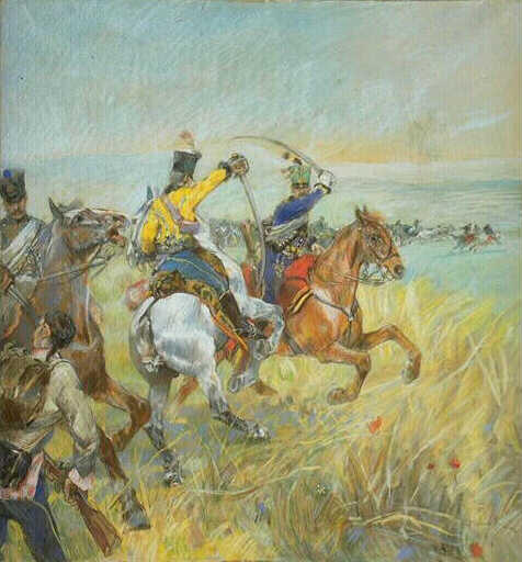 scène (bataille, cavalier, uniforme, cheval, champ, blé)
