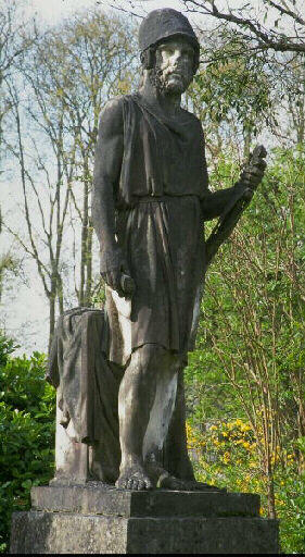 Cet homme barbu, en pied et casqué, est habillé d'une courte tunique à la grecque resserrée à la taille. Dans sa main gauche levée, il tient la garde de son épée logée dans son fourreau, tandis que son autre main enserre un rouleau. Il est adossé à un socle recouvert d'un drapé sur le côté droit duquel est représenté une coupe. La terrasse, le drapé et la figure sont recouverts de mousse noire. Le nez de la figure est cassé