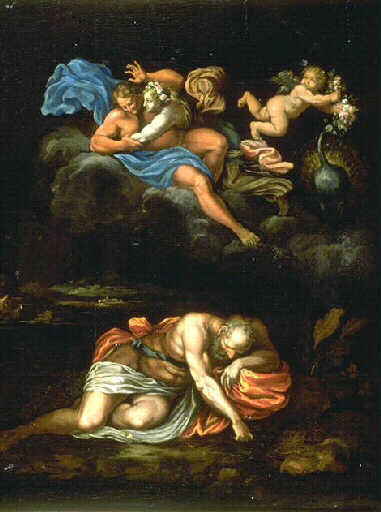 dans la liste annotée par J.G. Lemoine en 1939 (cf. bibl.) :'92. Panneau bois ; allégorie du XVIème siècle; très intéressant; à identifier; pourrait être des Carrache'. Interprétation médiocre et très libre de la fresque d'Augustin Carrache 'Aurore et Céphale' exécutée au centre de la voûte de la Galerie du palais Farnese à Rome. La présente copie bordelaise place maladroitement l'une au-dessus de l'autre les deux parties gauche et droite normalement alignées de la composition originale : le groupe, représentant Aurore violant le jeune chasseur athénien Céphale (représenté ici sans son char) et l'Amour qui s'enfuit, est situé ici au-dessus de la figure de Tithon (époux d'Aurore) endormi; l'auteur de la copie a ajouté en haut à droite le paon de Junon (déesse des amours légales), vers lequel s'élance l'Amour les bras chargés de fleurs, de manière à transformer sans doute la scène en allégorie de la fidélité conjugale: Ovide raconte en effet que Céphale résista aux séductions de l'Aurore et demeura fidèle à son épouse Procris.