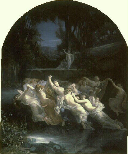 scène (femme, nymphe, danse, nappe d'eau) ; fond de paysage