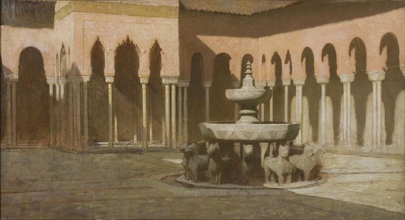 vue d'architecture (Grenade e e, palais, colonnade, cour, fontaine, sculpture : lion)