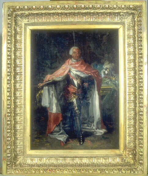 Etude préparatoire pour le tableau "Portrait de Charles III d'Espagne" conservé au musée de l'Ermitage à Saint-Petersbourg (info Jose de la Mano, spécialiste de Maella lors de son passage au C2RMF où le tableau était étudié) ; N° RF 1956-6 de la collection du Louvre