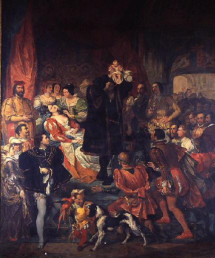 scène historique (Henri IV, Albret Henri d', Albret Jeanne d', France, Navarre, naissance, nourrisson, royaume, nu) ; scène historique (Albret Jeanne d', femme, accouchement, couché, lit, estrade, intérieur, baptême, foule, noblesse, clergé, soldat, arme, nain, perroquet, chien, épagneul)