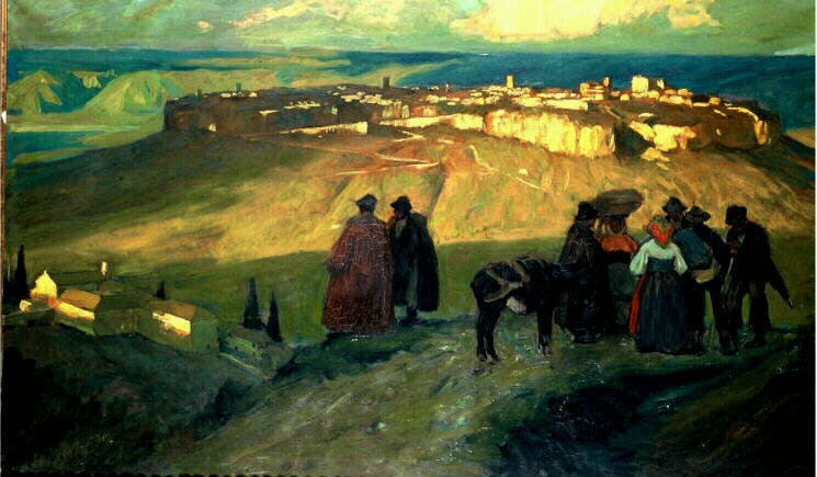 scène (personnage, agriculteur, femme, homme, âne) ; paysage (Orvieto, ville, montagne, chemin, ferme, hameau)