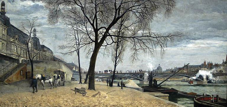 paysage (Paris, Seine, cadre urbain, quai, péniche, rivière, maison, pont, fiacre, personnage, promenade)
