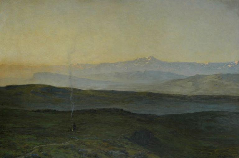 paysage (Pyrénées, Haute-Garonne d, montagne, vallée, lever du jour, effet de soleil) ; paysage (homme, chasse, feu, fumée)