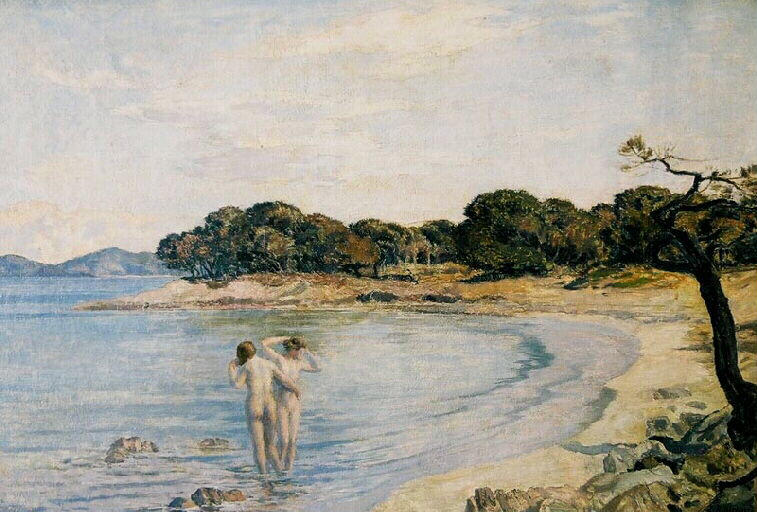 scène (femme : nu, baignade, mer, bord de mer, pin)