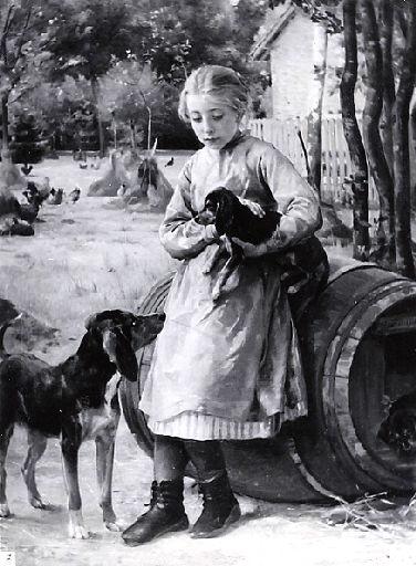 scène (fillette, robe, tablier, petit d'animal, chien, niche, tonneau, poule, coq, foin, palissade, cour de ferme, maison, arbre, bosquet)
