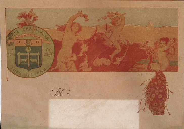 signé à mi-hauteur à droite : E Bordes ; Titré dans un médaillon à gauche : : Fête des Fleurs URBIS PALLADIUM ET GENTIS 12 avril An 1898 VILLE DE PAU