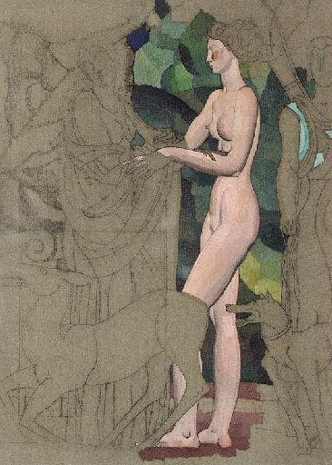Louis Billotey appartient à cette passionnante génération d'artistes de l'Entre-Deux-Guerres qui a su renouveler l'esprit et les modèles de la peinture décorative française. Cette étude fascinante est préparatoire à l'oeuvre qui fut présentée au Salon des Artistes français de 1936. Celle-ci fut acquise par l'Etat pour être finalement déposée au Musée d'Art et d'Industrie André Dilligent de Roubaix. Le sujet est emprunté à la tragédie d'Euripide, Iphigénie à Aulis. Fille de Clytemnestre et d'Agamemnon, Iphigénie fut condamnée par son père, sur le conseil du devin Calchas, à être sacrifiée à Artémis. En effet, la déesse de la Chasse, irritée par une grave offense, empêchait la flotte grecque de quitter Aulis pour gagner Troie. Au moment du sacrifice, Artémis, attendrie par la pureté d'Iphigénie lui substitua une biche puis l'enleva dans une nuée et la transporta en Tauride. Privilégiant les héroïnes de ce drame, Louis Billotey dévoile la chaste nudité d'Iphigénie. Clytemnestre, dans un mouvement d'appréhension, retient la marche au supplice de sa fille tandis qu'Artémis , impassible retient fermement un chien de sa meute. On devine au premier plan les contours stylisés de la biche qui sera finalement immolée. Dans cette étude complexe, seule l'étrange anatomie d'Iphigénie est véritablement aboutie. Ce corps, aux membres démesurément allongés, semble procéder d'une libre interprétation des canons de l'art bellifontain. Curieusement, le fond végétal, traité par masses et volumes décomposés, paraît répondre aux recherches du cubisme décoratif des années 20. Ce caractère hybride, loin de nuire au sujet, en renforce le pouvoir d'évocation. On remarquera enfin que l'artiste, en éludant le dessin des yeux, plonge cette scène dans une sorte d'atmosphère atemporelle pétrifiée par l'incommunicabilité. (GA. 15 ans d'acquisition 09/2008)