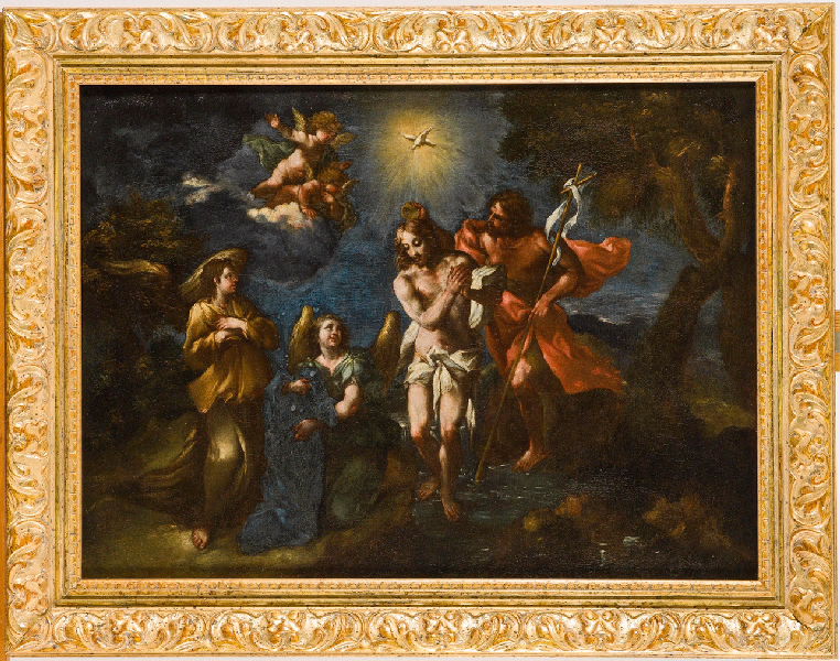 scène biblique (Baptême du Christ, Saint-Esprit, ange, colombe, rayons lumineux)