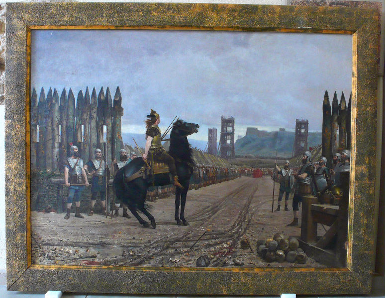 scène historique (César Jules, Vercingétorix, Romain, Alésia, cavalier, armure, camp militaire, rempart, tour fortifiée, soldat)