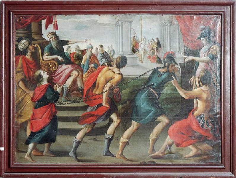 scène biblique ; fond de paysage (Vierge, femme, martyre, roi, trône, chaîne, vêtement, casque, colonne, martyre)