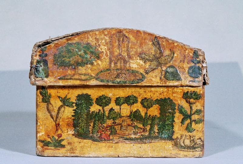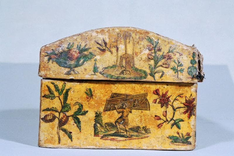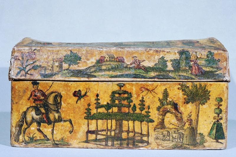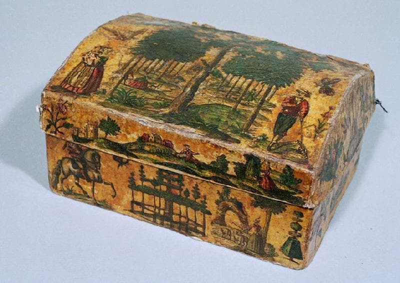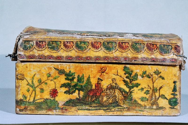 coffret orné de gravures découpées et collées