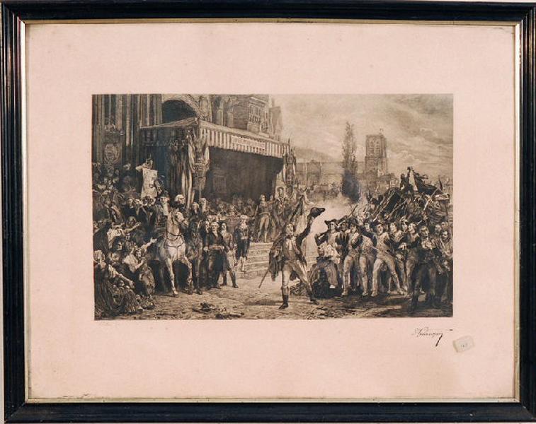 scène historique (Napoléon Ier, empereur, foule, armée, architecture, église, acclamation, cheval)