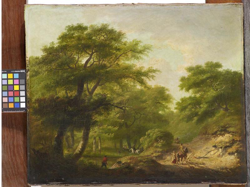 scène (chasse, cavalier, cheval, chien, forêt, chemin, feuillu)
