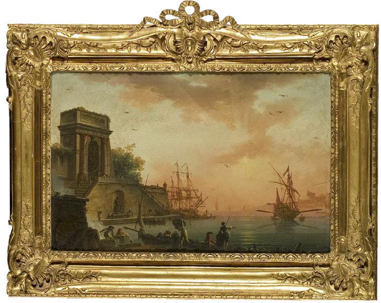 La marine est un genre pictural très en vogue en France au XVIIIe siècle. Si certains peintres privilégient la mer et les océans, Charles Lacroix de Marseille s'intéresse surtout aux vues de port et s'installe en Italie dès la fin des années 1740. Plus qu'une simple représentation d'un site maritime, Lacroix de Marseille a peuplé sa composition de petits personnages, gardes, pêcheurs et promeneurs, pris sur le vif. Les couleurs solaires - rouge, rose, jaune et orangé - ainsi que les délicats reflets à la surface de l'eau confèrent à cette peinture de petit format, un raffinement caractéristique des arts à l'époque de Louis XV. voir aussi : Marine de nuit (CA 339) Pendant