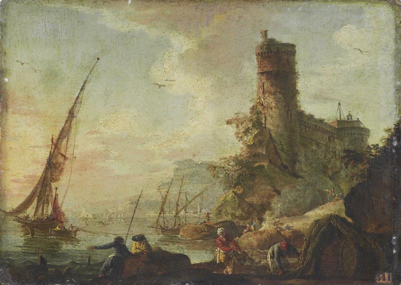 paysage (bord de mer, rocher, bateau à voiles, barque, château) ; scène (pêche à la ligne, homme, pêcheur, femme, coiffe, pêche aux engins)