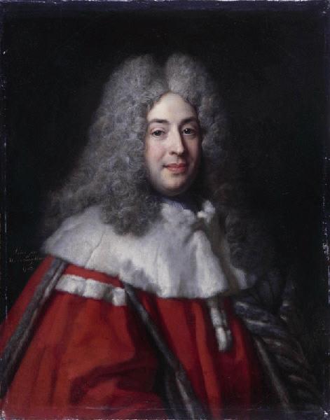 Président au Parlement de Bourgogne, Jean Bouhier (1673 - 1746) a souvent été confondu avec son cousin Antoine-Bernard Bouhier de Lantenay, conseiller au Parlement par lettres de 1692 et entré effectivement en fonction en 1693. Le Musée de Dijon conserve le portrait de ce dernier (inv. CA 358) où il a figuré jusqu'ici, mais à tort, sous le nom de Largillière ; l'oeuvre doit être rendue à coup sûr à Hyacinthe Rigaud selon G. de Lastic Saint-Jal (communication écrite, 1973). Fils aîné de Bénigne Bouhier, Jean IV Bouhier va, en 1689, étudier le droit à Paris, puis à Orléans, pendant trois ans. Son père lui achète alors sa charge en 1727, date à laquelle il est élu membre de l'Académie française, où Voltaire lui succèdera. Marié en 1702 à Jeanne Bourru, veuve de M. Boucher, conseiller au Parlement de Paris, il devient veuf, et se remarie en 1717 à la chapelle du château de Lantenay avec Marie-Claude Bouhier, la fille de son cousin Antoine-Bernard. Une gravure de Jean-Louis Daudet, graveur à Lyon de 1722 à 1744, datée 'Lugduni 1732', et qui porte l'inscription 'Largillierre pinxit', reproduit le portrait exécuté par le peintre alors que le président venait d'être nommé dans sa charge. Il est figuré en buste, dans un ovale entouré d'un cadre où l'on peut lire les mots : JOAN BOUHIER IN SENAT. DIVION. PRAESES INFUL. ANN. MDCCIV.AET. XXI.ACADEM. GALL. SOC. ; un génie désigne ses armoiries, d'azur au boeuf d'or, tandis que ses célèbres collections sont évoquées à gauche par des empreintes de pierres gravées, et des bustes et des statuettes du côté droit. Bénigne Bouhier avait en effet chargé son fils aîné du soin de la bibliothèque familiale, fondée au XVIe siècle et continuellement enrichie depuis. D'après A. Ronsin, qui lui a consacré une étude approfondie (1971), elle comptait plusieurs dizaines de milliers de volumes, et Jean Bouhier ne cessa de la développer. A la partie inférieure de la gravure sont inscrits sur le socle qui supporte le tout deux vers latins de Bernard de La Monnoye (Dijon, 1641 - Paris, 1728), à la louange du président, son ami. Avocat au Parlement en 1662, poète et philologue surtout connu pour ses 'Noëls bourguignons' publiés en 1700 et 1701, il fut élu à l'Académie française en 1713. Selon les indications reçues de la famille dijonnaise qui possédait jusqu'ici le tableau, l'oeuvre provient de la succession d'Aimé Dumay, fils de Jacques Dumay, conseiller à la cour impériale en 1834, décédé en 1859, et frère de Victor Dumay, maire de Dijon. Doit-on reconnaître l'original peint par Largillière dans cette peinture, identique à l'effigie reproduite par Daudet et gravée dans le même sens ? L'inscription, à gauche, paraît rajoutée tardivement. La toile, autrefois pliée pour être adaptée à un cadre ovale, en conserve des marques, ce qui nuit à l'aspect du tableau dont la qualité n'est pas égale en toutes ses parties. Sans doute faut-il mettre au compte de l'usure le manque d'accent du vêtement, inférieur au visage. Pour G. de Lastic Saint-Jal, qui connaît le portrait par la photographie, la peinture doit être sans hésitation donnée à Largillière lui-même, dont l'abondante production ne se maintient pas toujours au niveau le plus élevé. (communication orale, 1980). En 1966 était acquise une faible copie de la même composition (inv. 4700), peinte dans le même sens, et augmentée à la partie inférieure d'une bande horizontale où l'on a ajouté la main gauche du personnage sortant de la manche à large revers, et à droite, une inscription. En haut à gauche figure le boeuf héraldique des Bouhier. (Notice de Marguerite Guillaume extraite du catalogue « Acquisitions récentes 1975 - 1980 », Dijon : musée des beaux-arts, 14 janvier - 9 mars 1981) ; Conseiller de 1693 à 1704, Président au Parlement de Bourgogne de 1704 à 1727, année de son entrée à l'Académie française. Ce dijonnais, esprit curieux et très érudit, s'attacha à enrichir, dans son hôtel de la rue Saint-Fiacre (Hôtel Bouhier de Savigny, 12 rue Vauban) la bi bliothèque familiale, fondée au XVIe siècle, dont la renommée passera les frontières de la province. A sa mort, elle comptait 35000 volumes et 2000 manuscrits. 1703 est une date erronée, il faut sans doute lire 1704. ; en rapport avec : Largillière, Portrait de Mme Bouhier