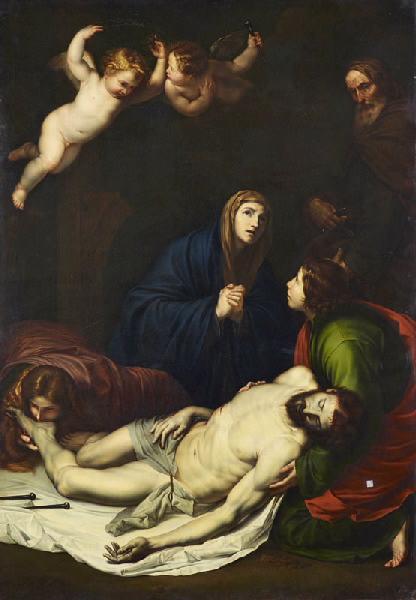scène biblique (Descente de Croix, sainte Madeleine, Vierge, agenouillé, main, joint, saint Jean l'Evangéliste, saint Joseph d'Arimathie, douleur, ange, portant, couronne)