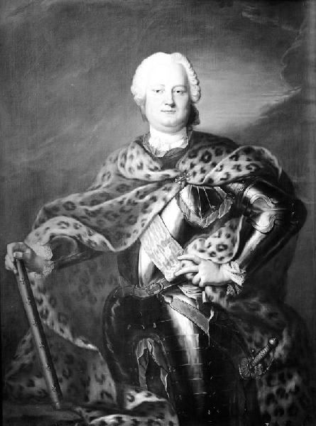 portrait (Leczinski Stanislas Ier, homme, roi de Pologne, à mi-corps, de face, perruque, armure, épée, sceptre, fourrure)