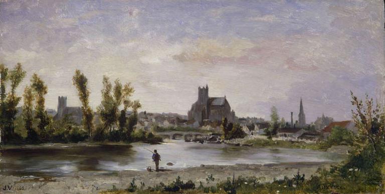 Ce petit tableau ne correspond pas à l'image habituellement connue de Veyrassat. L'artiste, élève de Daubigny et qui débuta au Salon en 1848, a été le peintre d'une certaine vie rustique, des passages de gué, des entrées de moisson, des chevaux hâlant les barques le long des rivières, des troupeau d'oies à la lisière des forêts, qu'il a répétés avec quelque monotonie. Au contraire, dans ce paysage représentant les bords de l'Yonne avec la ville d'Auxerre à l'arrière-plan - sans doute vue depuis l'île aujourd'hui disparue du Batardeau - et qui atteste sans doute la venue en Bourgogne de l'artiste en 1865, Veyrassat, délaissant tout effet d' anecdote, s'est attaché à représenter un paysage qui, dans son exécution et sa composition, se souvient de la leçon des Hollandais et des maîtres de Barbizon, notamment Daubigny. S'il s'attache à dépeindre davantage l'atmosphère campagnarde des bords de la rivière que la ville elle-même, on reconnaît toutefois aisément les principaux édifices civils et religieux de la petite cité bourguignonne : au centre, la cathédrale Saint-Etienne avec les maisons accolées à son flanc. A droite, dominant la partie nord de la vieille ville, l'église de l'abbaye Saint-Germain que l'artiste lithographia pour 'Les Voyages pittoresques de l'ancienne France' du Baron Taylor, ainsi que le pont Paul Bert. En avant de l'église, on aperçoit la tour Saint-Jean, à gauche, enfin, encadrée par un bouquet d'arbres se reflétant dans les eaux calme de l'Yonne, se profile la silhouette de l'église Saint-Pierre, reconnaissable à sa tour carrée inspirée de celle de la cathédrale. Le format modeste et le caractère d'esquisse de cette peinture qui coincide avec l'avènement du plein-airisme peuvent laisser supposer qu'il s'agit là de l'une de ces innombrables pochades réalisées alors directement dans la nature sur de petits panneaux de bois.