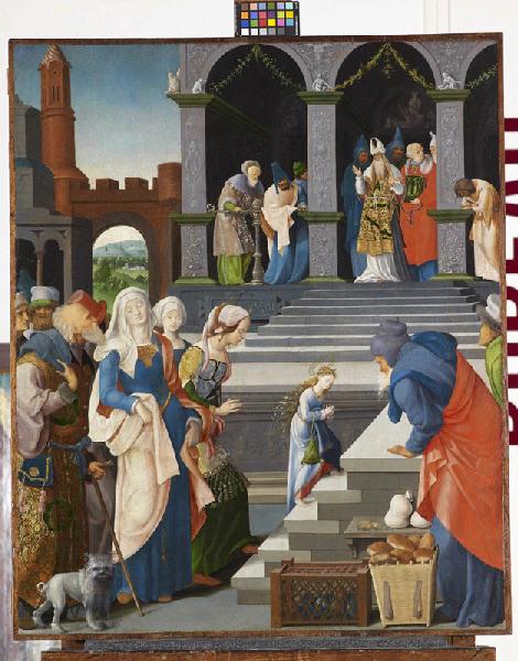 La mise en scène, qui isole l'adolescente dans un cadre architectural imposant, où elle est dominée par les hauts dignitaires ecclésiastiques, et sous les regards de l'assistance, ne manque pas d'intensité dramatique. L'artiste prend ses distances avec le modèle, où la Vierge se mêle au contraire à son entourage. Les silhouettes s'élancent, les physionomies s'adoucissent, et les femmes au long cou penchent leur tête, comme le font celles du panneau de l'hôpital de Cluny, baissant aussi leurs paupières qu'évoque à peine un trait de pinceau. Le luxe des détails fait oublier la rigueur géométrique de la composition. Vases, bucranes, animaux affrontés et grotesques couvrent d'un fin réseau les piliers du Temple, tandis que le parement du parvis est sculpté d'une frise en bas-relief. Au réalisme de la cage et de la hotte à pains s'accorde l'éclat des tissus chamarrés, de la passementerie, de la chevelure enfantine qui s'éparpille en étincelles, et des vermillons alliés au brun mordoré ou des roses associées au bleu nuit.