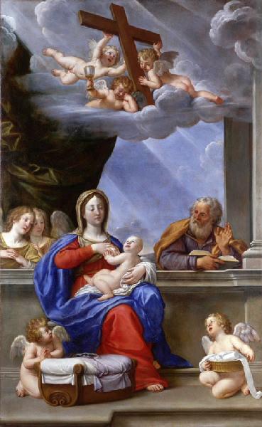 Il existe deux autres versions de la composition de Dijon, l'une à l'église San Paolo in Monte, à Bologne, sans doute une copie, la seconde, peinte sur cuivre (H. 54 ; L. 39), au Musée Poldi-Pezzoli à Milan. Le thème de la Sainte Famille associée à l'évocation de la Passion est en outre représenté par l'Albane à l'église Santa Maria di Galliera, à Bologne. A. Perez Sanchez ('Pintura italiana del siglo XVII en Espana', Madrid, 1965, p. 84) signale dans l'ancienne collection espagnole Cruz Bahamonde une 'Allégorie sacrée', maintenant disparue, où l'on voyait, au-dessus de la Sainte Famille, deux anges portant la Croix. Une gravure de Jean Audran d'après l'Albane représente l'Enfant Jésus couché, regardant la Croix et contemplé par deux anges. E. Van Schaack (comm. écrite, 1969) situe la grande pala de Dijon autour de 1630, date confirmée par la présence d'éléments communs à d'autres compositions exécutées pendant la même période. La Vierge s'apparente étroitement à celle du tableau de la Pinacothèque de Bologne, la 'Madone avec saint Jean-Baptiste, saint Matthieu et saint François d'Assise' ; son style monumental n'est pas sans rapport avec celui des figures de la 'Justice' et de la 'Paix' à l'église Santa Maria di Galliera, à Bologne, dont la décoration, peinte autour de 1630-1632, présente plusieurs analogies avec la toile de Dijon. Dans ce tableau apparait le caractère un peu ambigu de l'art de l'Albane, empreint d'une profonde gravité religieuse et situé dans un cadre solennel, rigoureusement composé suivant un schéma de perpendiculaires et de diagonales, tandis que la corbeille et le berceau rappellent le caractère intime de la scène familière, où la grâce des corps d'enfants évoque le frémissement de la vie. (Notice de Marguerite Guillaume extraite du 'Catalogue raisonné du musée des beaux-arts de Dijon, Peintures italiennes', Dijon, 1980) ; en rapport avec : Albane, La Sainte Famille, Bologne, Albani, La Sainte Famille, Milan, Anonyme, La Sainte Famille, Bruxelles