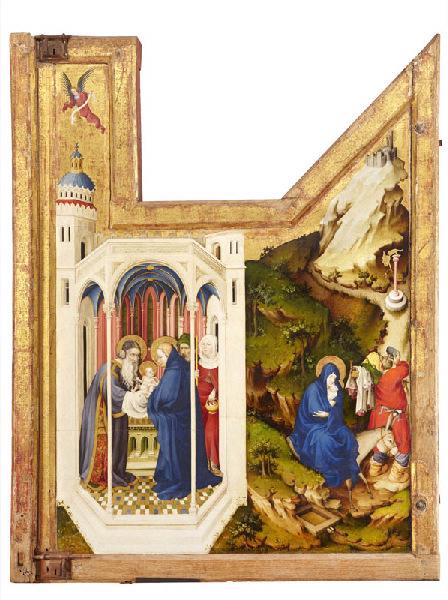 Retable de la Crucifixion ; L'Adoration des Mages, la Crucifixion et la Mise au Tombeau (sur la partie centrale) ; Figures de saints et de saintes (sur les volets gauche et droit) ; L'Annonciation et la Visitation (sur le volet gauche (revers)) ; La Présentation au Temple et la Fuite en Egypte (sur le volet droit (revers))