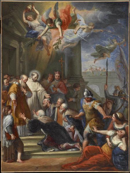 scène historique ; figure (saint Bernard de Clairvaux, Innocent II, Victor IV, femme, allégorie, mensonge, soldat, étendard, ange, en vol, tiare, rameau, olivier, glaive, poursuite, torche, allégorie, dispute) ; fond de paysage (balustrade, musicien, trompette)