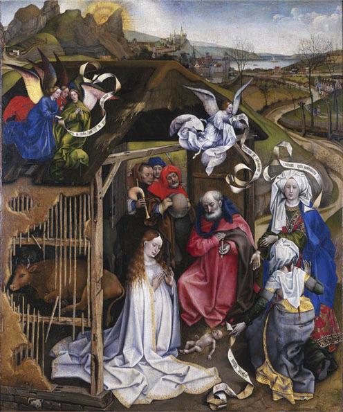 Ce tableau synthétise trois épisodes de la Nativité du Christ et puise à plusieurs traditions : le récit de la Nativité de Jésus dans la crèche et de l'Adoration des bergers est tiré des 'Evangiles', en particulier de celui de Luc. Mais, comme dans la vision qu'eut sainte Brigitte de Suède lorsqu'elle visita la grotte de la Nativité à Bethléem en 1372, la Vierge est vêtue de blanc et laisse flotter ses cheveux sur ses épaules. La lumière qui irradie de l'Enfant éclipse toute lumière, celle du soleil dans le ciel comme celle de la bougie de Joseph. Trois bergers sont venus adorer l'Enfant. Ils assistent à la scène par une fenêtre de l'étable, mais leur position centrale dans la composition, en 'tableau dans le tableau', attire l'attention sur eux. Les deux femmes en somptueux costumes sont les sages-femmes. Leur histoire est contée dans les 'Evangiles apocryphes'. L'une d'elles, Azel, reconnut que la naissance de Jésus n'avait pas altéré la virginité de Marie. L'autre, Salomé, refusa de le croire. Sa main se dessécha. Sur le conseil d'un ange, elle toucha l'enfant et fut guérie. Le paysage offre un commentaire naturel à l'épisode sacré. Les arbres sont encore dépouillés de leurs feuilles mais à l'absence de neige, à l'eau qui court dans le ruisseau, on sent que les rigueurs de l'hiver sont passées : ce qui rappelle que Noël suit de peu le solstice d'hiver, donc le triomphe progressif de la lumière sur l'ombre. Avec l'exacte description de la saison et de la lumière, les couleurs qui s'atténuent dans le lointain, l'utilisation de la route qui serpente pour suggérer la profondeur, ce paysage est, vers 1425, l'un des premiers paysages naturalistes de la peinture occidentale. C'est une des parties les plus intéressantes de ce tableau, où sont multipliées les recherches novatrices, dans les personnages, le réalisme des visages ou le rendu attentif des matières. La composition comporte cependant encore des archaïsmes : les rochers aux formes étranges, la juxtaposition de trois épisodes, la présence des phylactères, l'horizon encore haut, la transition pas totalement satisfaisante entre personnages et paysage, accentuée par la coexistence de deux lumières : au premier plan, une lumière frontale qui sculpte les volumes des personnages ; dans le paysage, la lumière du soleil qui crée de longues ombres. Le tableau a été acheté par le musée en 1828. Il est sans doute depuis le Moyen Age en Bourgogne, mais on n'a que des hypothèses sur sa provenance. (Notice de Sophie Jugie extraite de 'Le musée des Beaux-Arts de Dijon', RMN, musée des beaux-arts de Dijon, Paris, 2002) ;voir aussi : Messagerie III (2010-7-1), Maître de Flémalle, Nativité et Adoration des bergers (2015-4-3) oeuvre en rapport