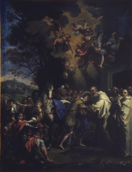 Le tableau provient de l'abbaye de Cîteaux. La peinture a été saisie à la Révolution et se trouve au Musée en 1799. François Devosge mentionne dans son inventaire trois tableaux de même sujet provenant de l'abbaye de Cîteaux : l'un d'eux, dont les mesures correspondent à celui de Dijon, peut s'identifier avec lui ; les deux autres sont considérés comme copies et signalés comme vendus. Le premier doit sans doute être reconnu dans la toile conservée à l'église de Jouhe (Jura) ; le second, plus petit, n'a pas été retrouvé jusqu'ici. [...] Saint Bernard est accueilli à la porte du monastère par saint Etienne Harding, accompagné des jeunes gens qu'il a recrutés. A genoux, au premier plan, son père, Testelin le Sor, ouvre les bras en signe d'offrande. Bernard a déjà perdu sa mère Aleth : c'est sa soeur Hombeline que le peintre a figurée, en pleurs, au fond et à gauche du tableau, peut-être en s'inspirant du récit de l'historien Chrysostomus Henriquez ('Lilia Cistercii'). On aperçoit à l'horizon la demeure de Fontaine, tandis que le costume de guerrier de son père, et la présence du cheval, attestent la naissance aristocratique du nouvel arrivé. Celui-ci porte un pourpoint inspiré de la mode de la Renaissance, qui côtoie curieusement le costume à l'antique de Tescelin. L'aspect désuet de ce vêtement trahit-il un souci archéologique du peintre, soucieux de replacer la scène à son époque, en 1112 ? Dans le ciel, les angelots portent une mitre et une crosse d'abbé, signes de la future mission de Bernard à Clairvaux. Le renoncement et l'acceptation de la souffrance sont symbolisés par la croix et la couronne d'épines. Le personnage debout à droite a une expression si véridique qu'il ne peut s'agir que d'un portrait. Mariette cite le tableau, qu'il a vu à l'église de l'abbaye : 'Le révérend père Etienne Prinstet, qui était alors procureur général de l'Ordre de Cîteaux en cour de Rome', écrit-il, 'le fit faire au Passeri, et fit ensuite graver la planche au chevalier Dorigny. Il s'y est fait représenter sous la figure d'un des religieux de saint Bernard, qui est sur le devant et qui regarde de face ; la tête est le portrait du père Prinstet, qui, s'étant retiré à Cîteaux, y est mort en 1727, âgé de 77 ans. M. Dorigny m'a assuré que ce n'est point le portrait du père Prinstet mais celui du père Raydelet, son compagnon'. L'additif de 1705 à l'inventaire de 1699 (Archives départementales) précise que le tableau a été donné par le père Prinstet. [...] (Notice de Marguerite Guillaume extraite du 'Catalogue raisonné du musée des beaux-arts : peintures italiennes', Ville de Dijon, 1980) ; en rapport avec : Passeri, L'Entrée de Saint Bernard à Cîteaux, Wind, Passeri, L'Entrée de Saint Bernard à Cîteaux, Jouh, Dorigny, Entrée de Saint Bernard, Paris