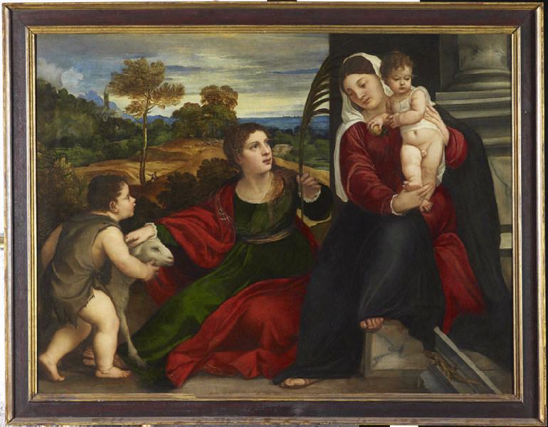 C'est en 1946 qu'elle est déposée à Dijon ; L'oeuvre a été gravée à l'eau-forte par Lerouge sur un dessin de Girod terminé par Langlois jeune (Filhol, 1815, pl. 674) et par C. Normand (Landon, 1832, pl. 17). Très controversée, l'attribution de ce tableau à Titien n'a pas réussi à susciter l'unanimité de la critique. Refusée par Waagen en 1865, Heinemann en 1928, Tietze en 1936 et Valcanover en 1960, qui considèrent la peinture comme une oeuvre d'atelier, elle est toutefois reconnue par Louis Hourticq (1912 et 1919), Suida (1933), Berenson (1932, 1936 et 1957), et affirmée à nouveau en 1966 par Germaine Barnaud et Pierre Rosenberg après un examen approfondi à la suite d'une restauration de la toile, remise à peu près à sa première grandeur. Selon ces auteurs, il s'agirait non seulement d'une oeuvre autographe, mais encore d'un prototype du Titien dont apparaîtrait le souvenir dans certaines compositions comme la 'Sainte Famille avec le petit Saint Jean' donnée à Polidoro Lanziani au Louvre (inv. 745), où l'on retrouve, en sens inverse, le groupe de saint Jean et de l'agneau. Le tableau maintenant à Dijon aurait également servi de modèle pour certaines parties de la 'Sainte Conversation' de Palma Vecchio à l'Accademia à Venise, dont Gustavo Frizzoni avait, dès 1906, souligné les parentés avec la toile alors au Louvre, mais sans déduire cependant laquelle des deux peintures avait pu influencer l'autre. Le tableau de Venise peut avoir été achevé par un élève du Titien ; pour Tietze (1950) en effet, il paraît peu probable que soit de la main même du maître un fragment comme la tête de sainte Catherine, tout à fait semblable dans la toile de Dijon. Cette dernière en revanche, est franchement donnée au Titien en 1969 par Harold E. Wethey qui évoque la beauté des figures, le charme du paysage, et met au compte des restaurations les réticences exprimées par la critique ; la chemisette de l'Enfant, par exemple, serait une adjonction tardive. A notre avis il est cependant permis de douter de l'attribution de cette toile au Titien, à moins que son usure n'en explique le manque d'accent. Datée par Pierre Rosenberg entre 1520 et 1528, l'oeuvre est située par Harold Wethey autour de 1535. Par ailleurs, le sens symbolique d'un détail, le lézard en bas à droite du tableau, n'a jamais été précisé. Or l'iconographie de cet animal a été étudiée par Herbert Friedmann (1969) à propos d'une 'Madone entourée de saints' de Botticini au Metropolitan Museum de New York. L'auteur rappelle que dans l'antique 'Physiologus', le lézard passait pour recouvrer la vue en fixant les rayons du soleil, figurant ainsi, dans la légende, celui dont la cécité spirituelle est guérie par la quête de la vraie lumière ; Herbert Friedmann cite et reproduit, outre celui de New York, l'exemple de la 'Nativité' due à un épigone de Lippi, au Louvre, et de la 'Vierge adorant l'Enfant' de Botticini au Palais Pitti à Florence. (fig. 13) (Notice de Marguerite Guillaume extraite du 'Catalogue raisonné du musée des beaux-arts : peintures italiennes', Ville de Dijon, 1980) ; en rapport avec : Lanziani, La Sainte Famille,Paris, Palma le vieux, Sainte Conversation, Venise, Titien, Vierge à l'Enfant..., Londres, Titien, Vierge à l'Enfant..., Fort Worth