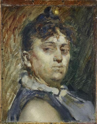 Cette étude de personnage féminin vu de trois-quarts pourrait représenter, selon l'inscription portée au verso du panneau, la soeur de la Goulue. On sait que Toulouse-Lautrec a réuni ces deux femmes dans la première lithographie qu'il a réalisée en 1892. En l'absence de toute autre indication, ce tableau reste mystérieux quant à son origine. Il ne semble pas qu'il puisse être d'Antonio Mancini comme l'avait tout d'abord pensé Pierre Granville. Raffaello Causa (1974) a suggéré d'y voir peut-être une oeuvre de Luca Postiglione (1876-1936), un élève de Mancini. Mais il n'est pas exclu également que cette peinture puisse être l'oeuvre d'un artiste allemand comme Max Liebermann (1847-1935) ou comme Lovis Corinth (1858-1925) qui a séjourné à plusieurs reprises à Paris à la fin du 19e siècle