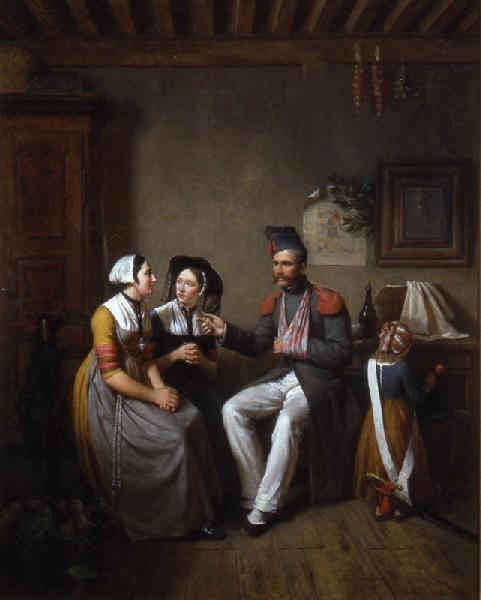 le tableau représente une scène d'intérieur; un soldat raconte ses campagnes militaires à deux femmes. - Le soldat est un grenadier. Il porte un pantalon blanc, une capote à col droit, des épaulettes rouges, un bonnet de police avec grenade d'infanterie, pompons rouges et passepoil rouges. Son bras gauche est attaché en écharpe autour de son cou. -- En face de lui, deux femmes sont assises : elles portent des robes de type mâconnais avec des manchons de broderie métallique et des carrés de mousseline de gaze glissés dans le décolleté de la robe en guise de gorgerette. Les deux jeunes femmes portent une coiffe bressane (coiffette ou coiffetaz type A1), avec un fond en mousseline brodé au plumetis froncé à la nuque et une mentionnière rouge. La jeune femme de droite porte un chapeau de type bressan (légère variante par rapport aux chapeaux traditionnels). Elles portent des bijoux : chaîne pour fixer la bavette du tablier et croix jeannette suspendue à un ruban de velours noir avec un coeur qui donne l'assise au pendentif. L'association avec une mentonnière rouge indique que la jeune fille est fiancée. Enfin, la jeune fille de gauche porte également une châtelaine à la ceinture. -- A côté du grenadier, un enfant joue avec le baudrier du grenadier. Ce petit garçon porte une longue jupe et un corselet noué dans le dos. Son bonnet régional est richement décoré de broderies métallliques (type C). -- Le décor de la pièce est constitué d'une armoire à panneaux de loupe, de chaises, d'un banc et d'une table. Un torchon est accroché au coin de l'armoire et un coffret à bonnets en bois peint ainsi que de la vannerie sont posés sur le sommet de l'armoire. Au mur sont suspendus un miroir au dos duquel est coincé une branche de laurier et une image populaire représentant 'Le Vrai portrait du Juif-Errant / Complainte nouvelle sur un air de chasse' édité en 1820 par la fabrique Pellerin à Epinal. Au plafond, deux tresses d'ail rose et d'herbes aromatiques sont suspendues. Sur la table, du pain et une bouteille de vin rouge sont posés. Le soldat vient probablement de prendre un en-cas. Un panier contenant des produits du potager est posé au pied de la jeune fille. -- Cadre en bois doré mouluré et stuqué