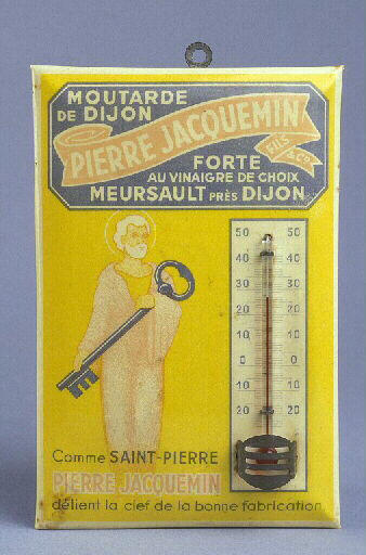 au recto : MOUTARDE / DE DIJON / PIERRE JACQUEMIN / FILS ET C[OMPAGN]IE / FORTE / AU VINAIGRE DE CHOIX / MEURSAULT PRES DIJON / (Saint Pierre) / Comme SAINTPIERRE / PIERRE JACQUEMIN / détient la clef de la bonne fabrication