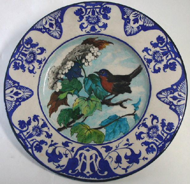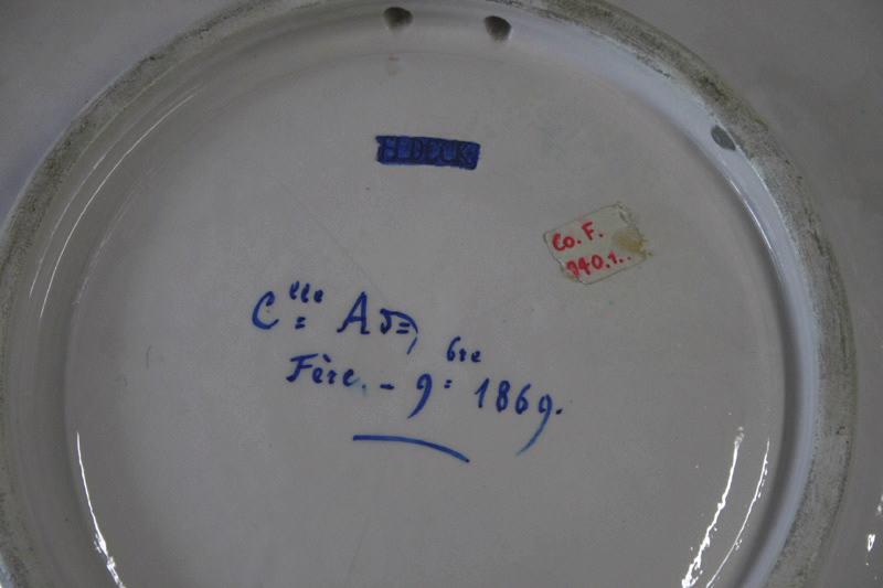date de création : novembre 1869 l'artiste ayant décoré le plat peut être identifié comme étant Adolphe Moreau (1827-1882) ou son épouse Camille Moreau (1840-1897)