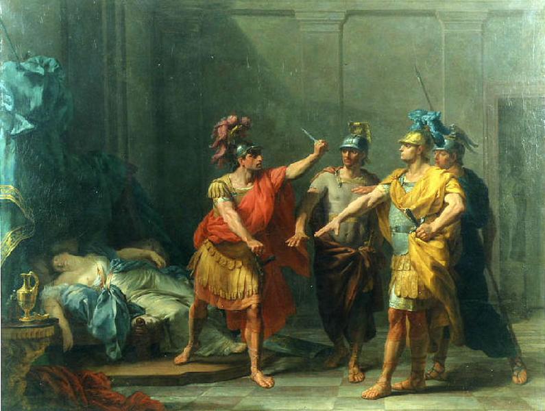 titre : La mort de Lucrèce, désignation inscrite sur le Registre des inventaires p. 9 ; Brutus, Lucretius Père de Lucrèce, & Collatinus son Mari, jurent sur le poignard dont elle s'est tuée, de venger sa mort & de chasser les Tarquins de Rome, désignation donnée lors du Salon de 1771