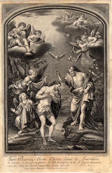 d'après le tableau du Baptême du Christ de Pierre Mignard en 1666 ; voir aussi : Le baptême du Christ (NP 312) autre représentation