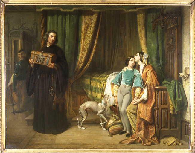 signature en bas à gauche : Claudius Jacquand ; signature, datation, annotation au revers : Gaston dit l'Ange de Foix / quitte sa mère réfugiée à la cour navaraise / la pauvre princesse pressent dans ce dernier / [...]ssement qu'elle ne reverra plus son cher enfant / en effet, Froissart raconte qu'il se laissa mourir de faim / dans la tour d'Hortey, désespéré d'avoir été l'instrument / involontaire de la haine [...]ili [...] de son oncle / Charles le Mauvais roi de Navarre [...]lemp[...]n[...] / peint par Claudius Jacquand Paris 1861 / tiré des chroniques de Froissart