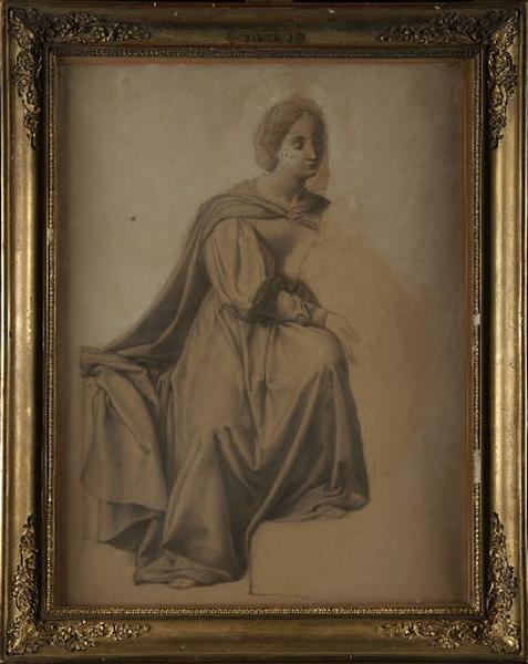 Une femme avec une auréole est présentée de trois-quarts, assise, vêtue d'une longue robe. Elle présente un enfant nu debout, déjà grand, qui lui est à peine esquissé