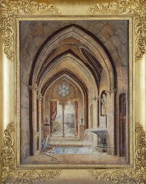 Canevas ; Un paralytique plonge ses pieds dans une fontaine placée dans un décor gothique.