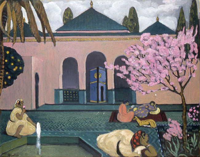 Des femmes au repos dans la cour pavée d'un pavillon marocain au centre duquel jaillit un jet d'eau. décor de palmiers et de pêchers en fleurs.