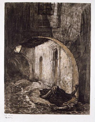 Dans une ruelle sombre, un homme gît au sol au premier plan; il est renversé sur le dos, un poignard à ses côtés.
