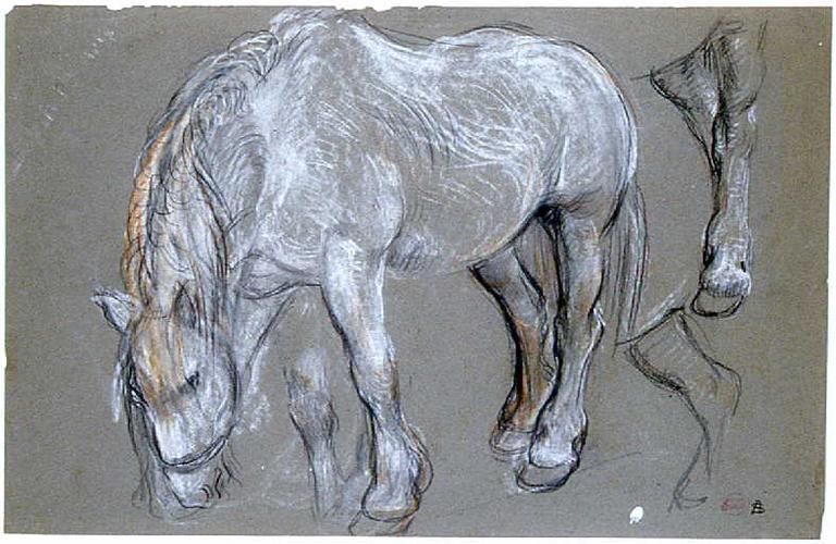 Trois esquisses : un cheval à la robe isabelle, et deux études de pattes.