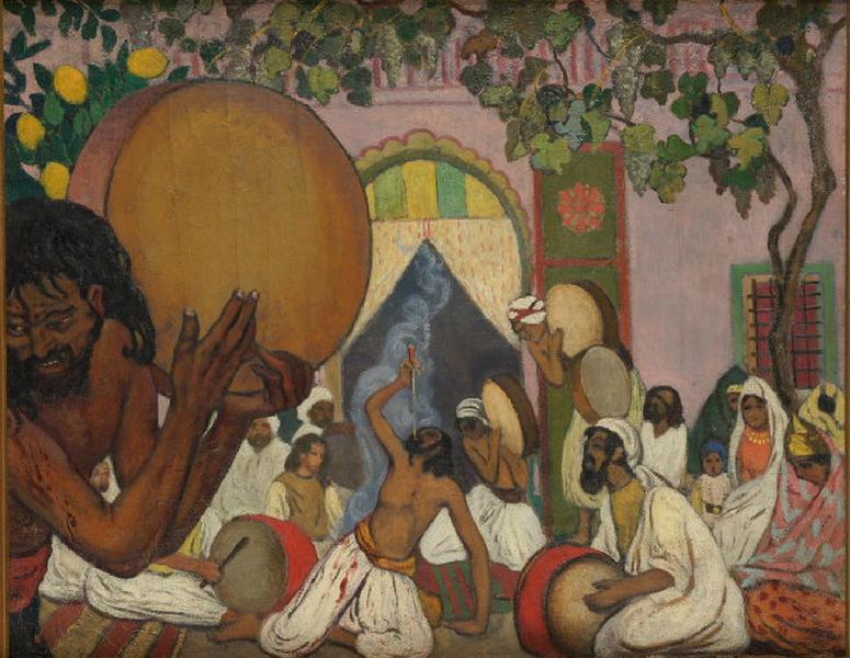 Séance de la secte aïssaoua. Sur la gauche, en gros plan, un homme au visage hagard martèle son grand bendir ou tambourin. Au centre, à l'arrière-plan, un fakir entouré de femmes et de musiciens se livre à son exercice barbare