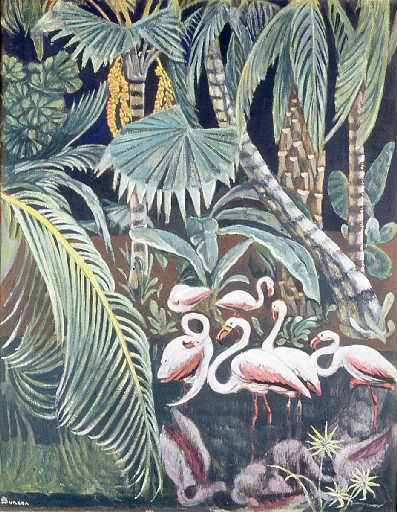représentation animalière (flamant rose, oasis, palmier, bambou)