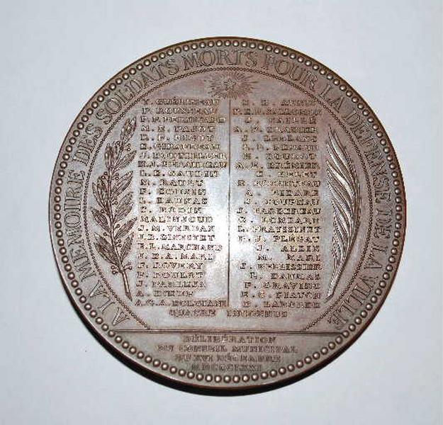 Avers: blason de la ville d'Autun; Revers: Liste des soldats morts pour défendre la ville d'Autun, encadrée par un rameau d'olivier et une feuille de palme