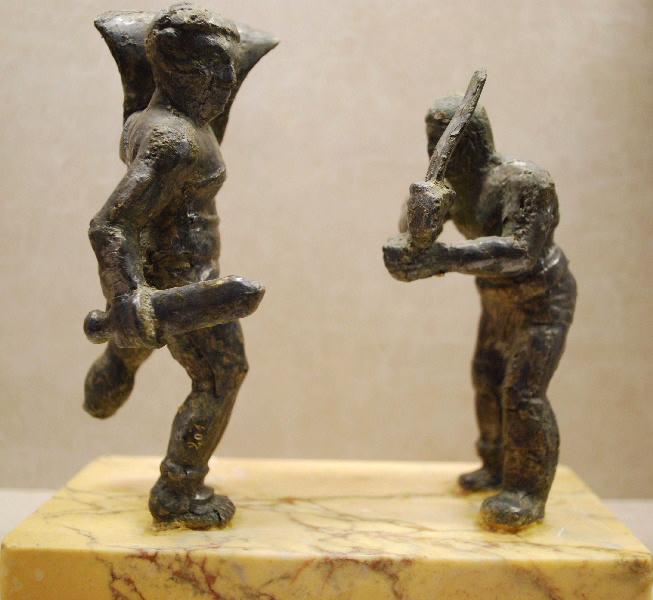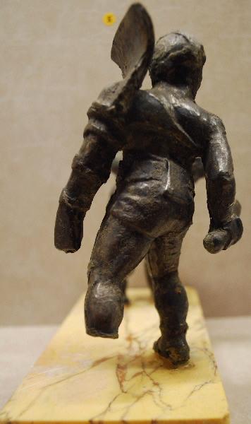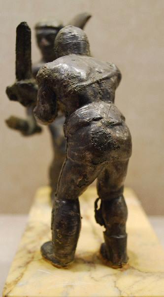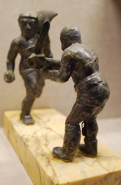 Groupe sculpté, en bronze, à la cire perdue, plaqué d'argent, présentant deux gladiateurs ; 'Le premier personnage porte la tenue habituelle du retiarius : subligaculum retenu par un ceinturon ou balteus, brassard ou manica au bras gauche, surmonté du galerus, pièce de métal destinée à protéger la tête, objet qui n'apparaît par régulièrement. Il ne possède pas de trident habituel qu'il devait tenir à gauche, mais une simple épée courte et droite, ce qui n'est pas rare; le filet qui constituait une de ses armes offensives est rarement représenté, et il n'apparaît pas ici. Le pied gauche est brisé; le droit est chaussé d'un bottillon court à rebords épais. Le second gladiateur ne présente pas l'équipement traditionnel du secutor : grand casque et bouclier long. Mais les variantes étaient nombreuses en ce domaine. La tête semble couverte d'un simple bonnet très enveloppant. Il porte lui aussi le subligaculum, une épée (sica) dans la main droite, le bras gauche par l'ocrea (cnémide recouverte de bandes de cuir). La jambe droite semble pourvue de lames de métal. Il s'agit peut-être alors d'un dimachairus, gladiateur qui ne possédait pas de bouclier; il aurait alors pu tenir de la main gauche le crochet destiné à arracher le filet du retiaire : le geste conviendrait mieux en effet au port d'un tel crochet qu'à celui d'un bouclier. L'intérêt de ces figurines tient partiellement au fait qu'elles ont été retrouvées ensemble, ce qui est rare pour des groupes. Elles sont toutefois d'un art médiocre, malgré le prix que devait leur donner leur revêtement d'argent. [...] Lebel, Boucher, Bronzes figurés antiques, 1975, pp. 74-75, n° 121 ; '[...] Le retiaire armé d'une épée, possède sur le bras gauche un brassard, surmonté d'une plaque de métal destinée à lui protéger la tête; le filer, arme offensive du retiaire n'apparaît pas ici; en revanche, un trident devait être autrefois placé dans sa main gauche. Le secutor, coiffé d'un bonnet, est simplement armé d'une épée. [...]' Guide du visiteur au MR et ML, 1984