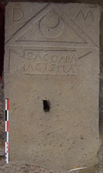 gravure, sur la face : D M PACONIA ACISILA : D(iis) M(anibus). / Paconia / Acisila, traduction : Aux dieux Mânes. (Ci-gît) Paconia Acisila ; inscription, A gauche, marquage